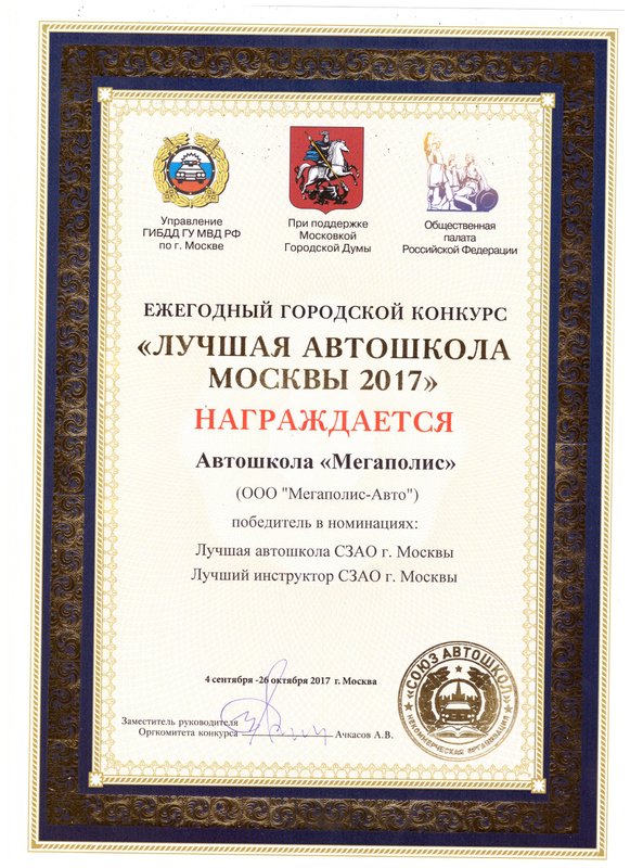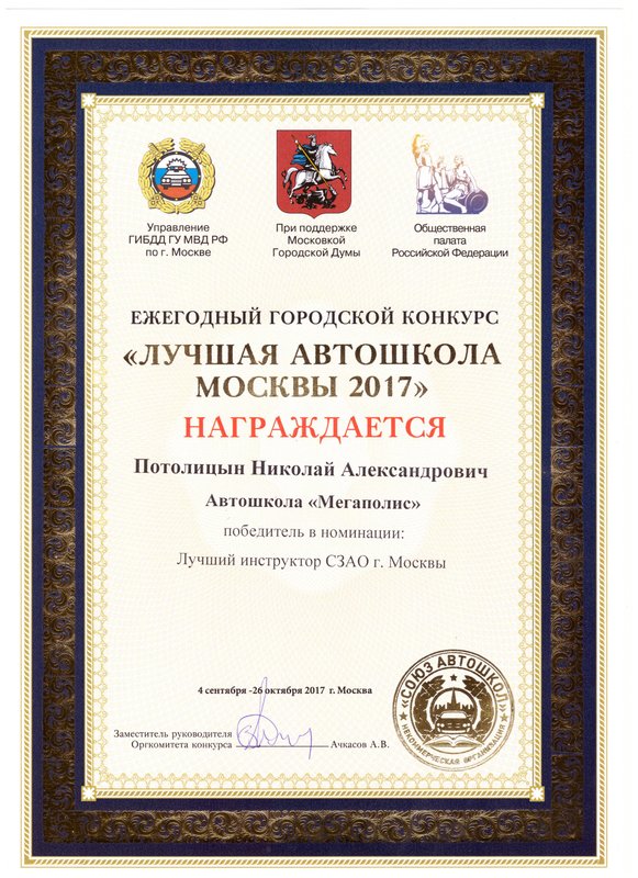 Участник конкурса "Лучшая автошкола Москвы-2017" в номинации «Лучший инструктор города Москвы 2017» - 11 место.